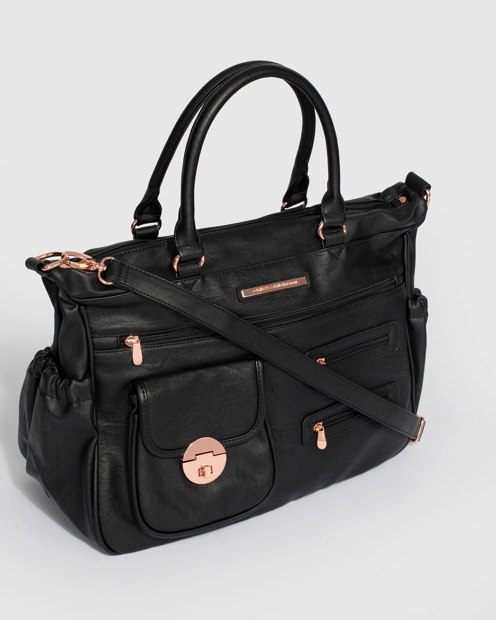 - Black finish with rose gold tone hardware