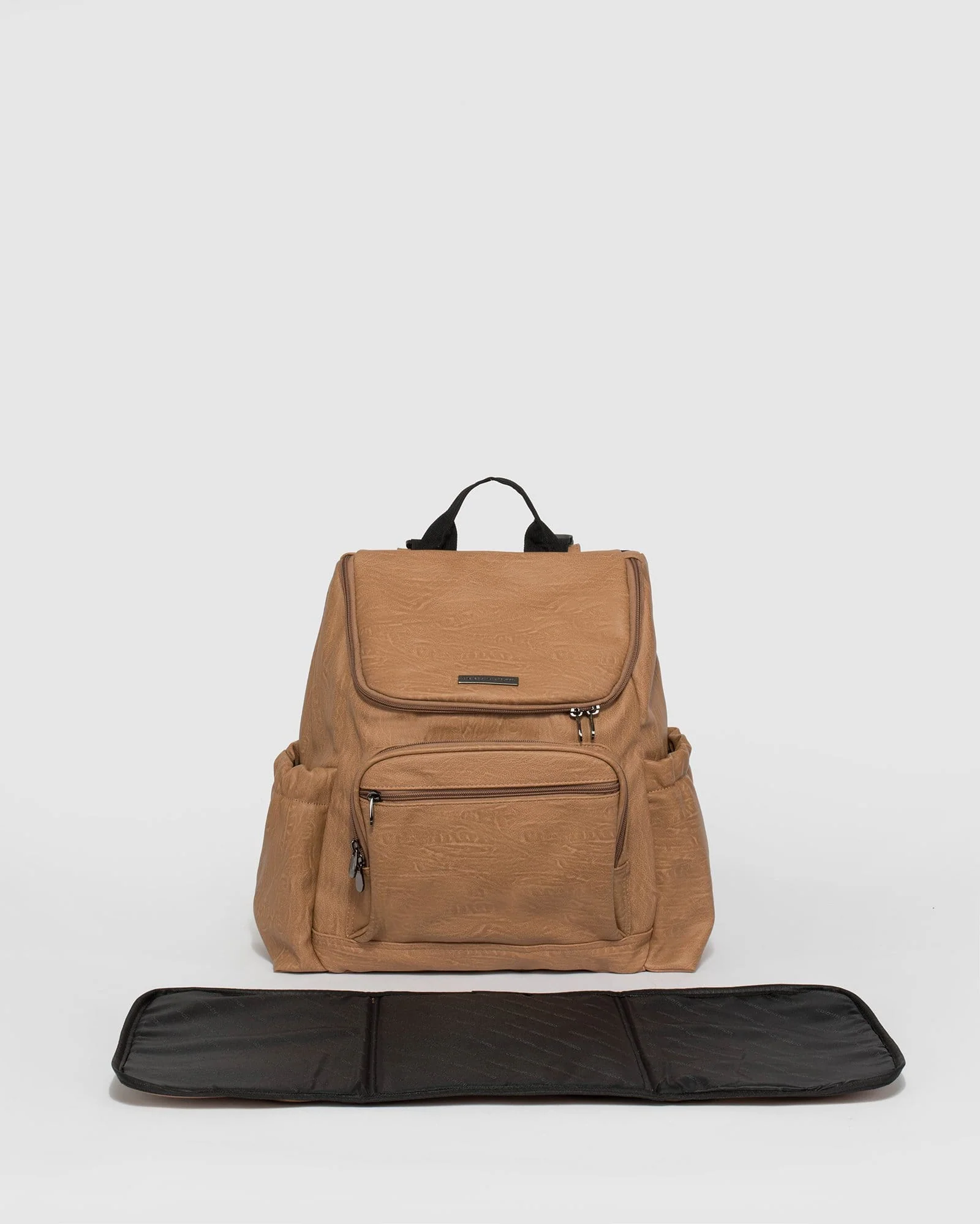 This Caramel Baby Bag Backpack is perfect for stylish mums on the go. The textured vegan leather has a luxurious finish, while the gunmetal-tone hardware gives a touch of luxury. The zip secures the top and front compartments, and there's an external zipped pocket on the rear panel for extra storage. There are elasticated pockets on the side panels for drinks or snacks, and two internal insulated pockets for bottles. There are also two internal slip pockets - one of which contains a removable baby changing mat. The adjustable shoulder back straps make it comfortable to wear.