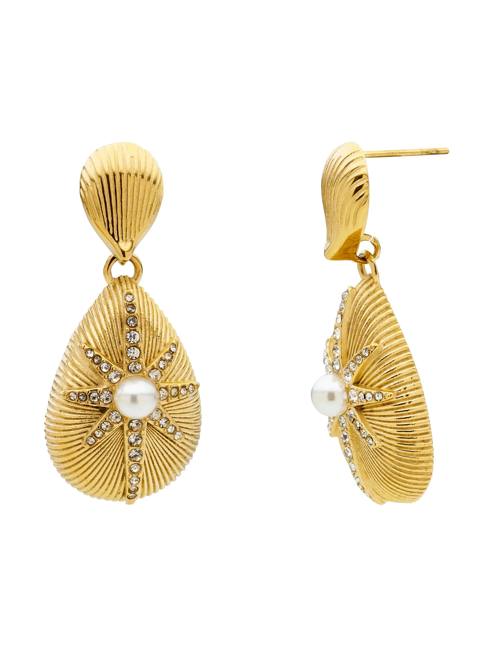 Give any outfit a gorgeous touch of sparkle and shine with the beautiful Celestial Drop Earrings from Amelie. These stunning earrings feature bright gold-coloured plating with a subtly textured finish, with an eye-catching starburst design in fine sparkling stones, and lustrous faux pearl accents.